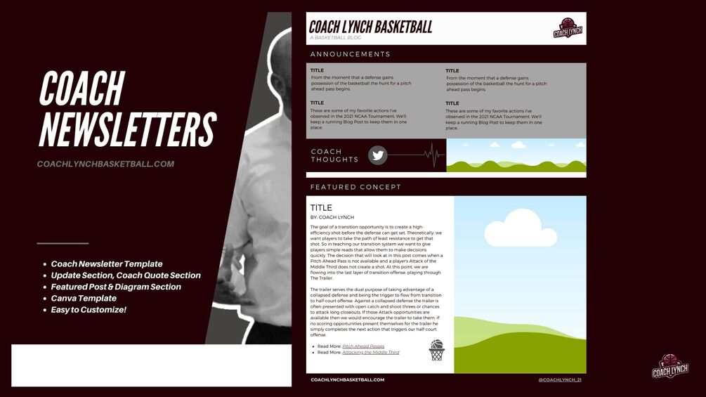 If you are looking to put together a Newsletter for your assistant coaches, youth coaches, parents of your team, or looking to get information out into Social Media Platforms this template is a great way to do this.